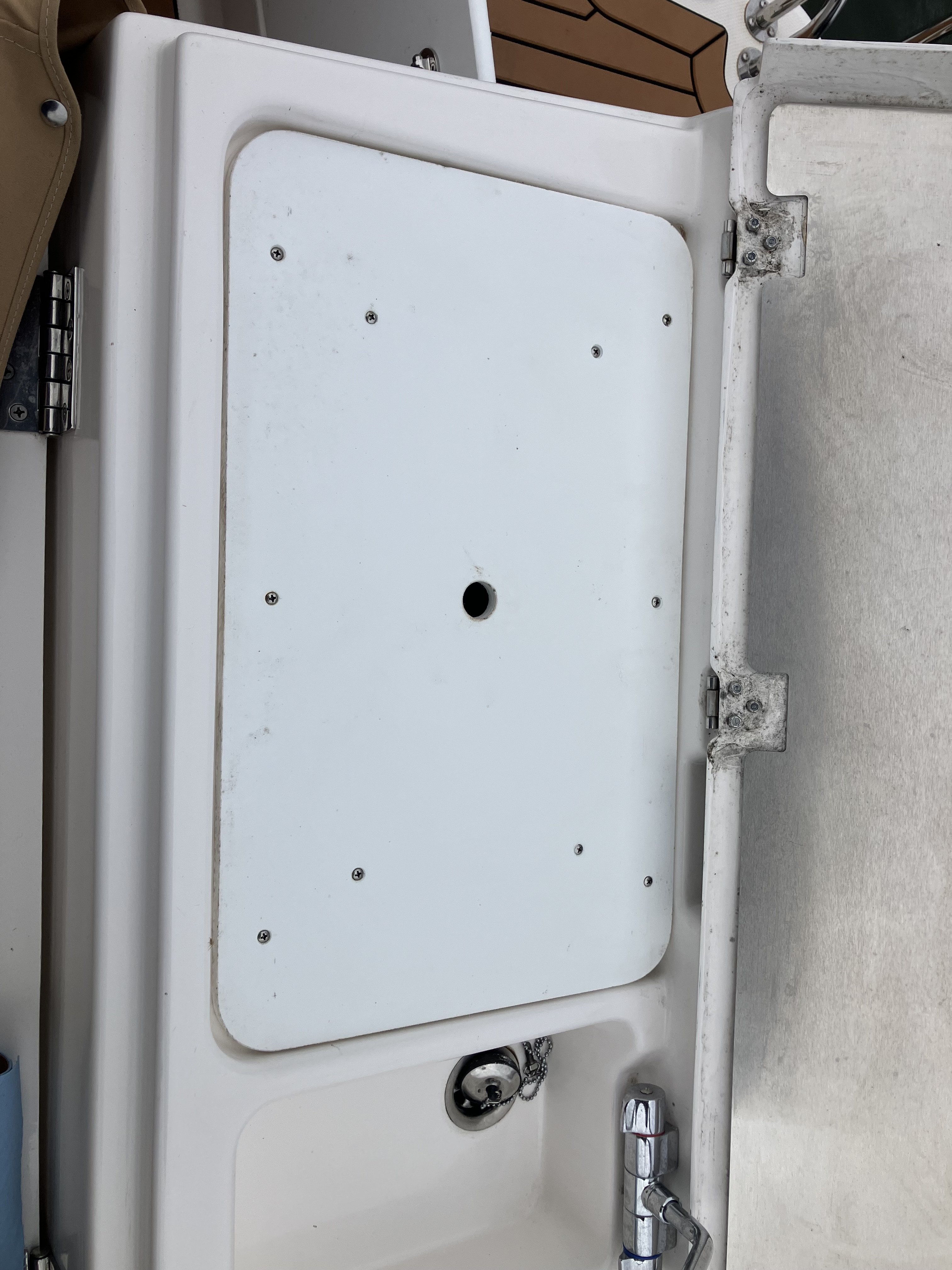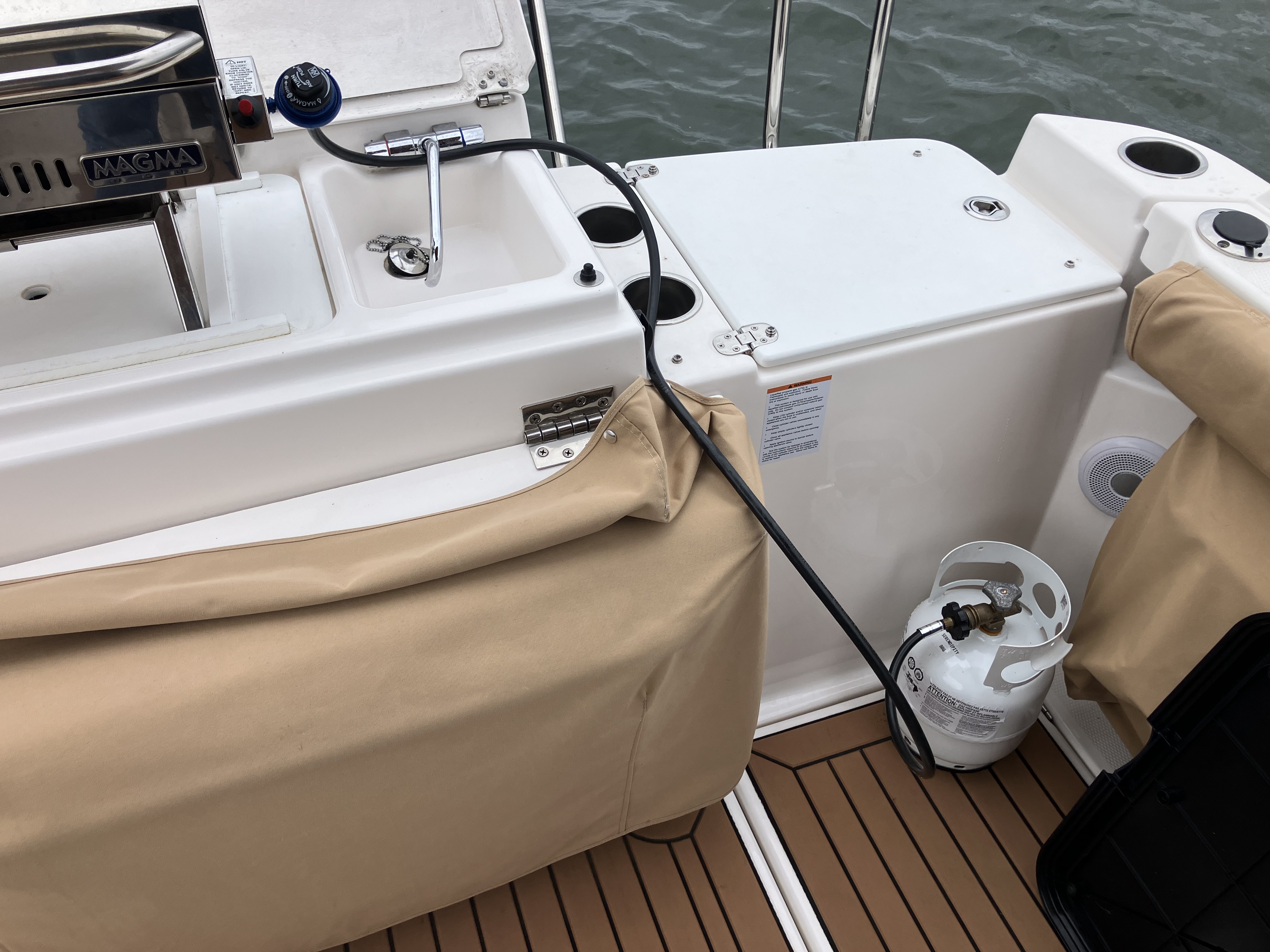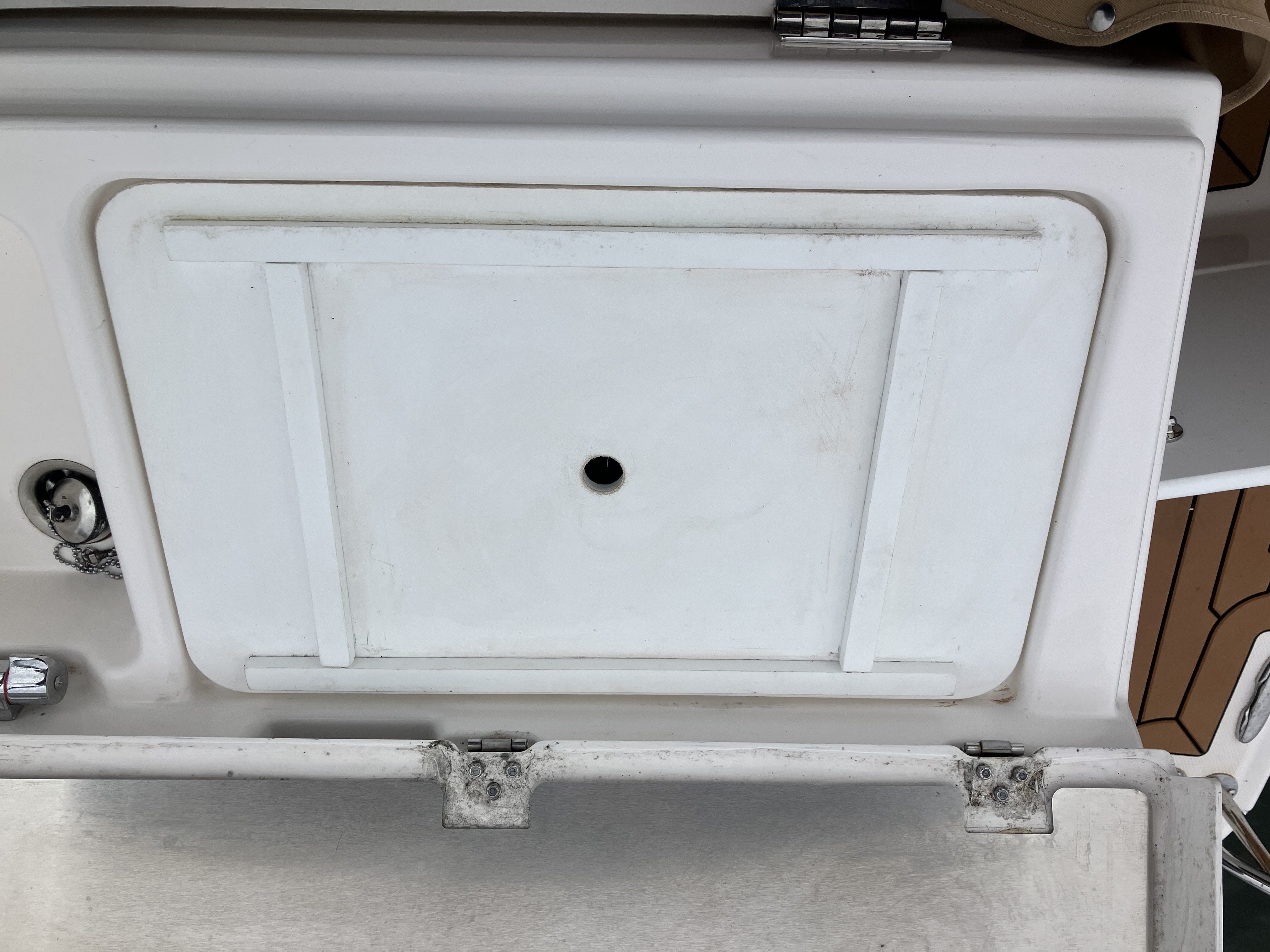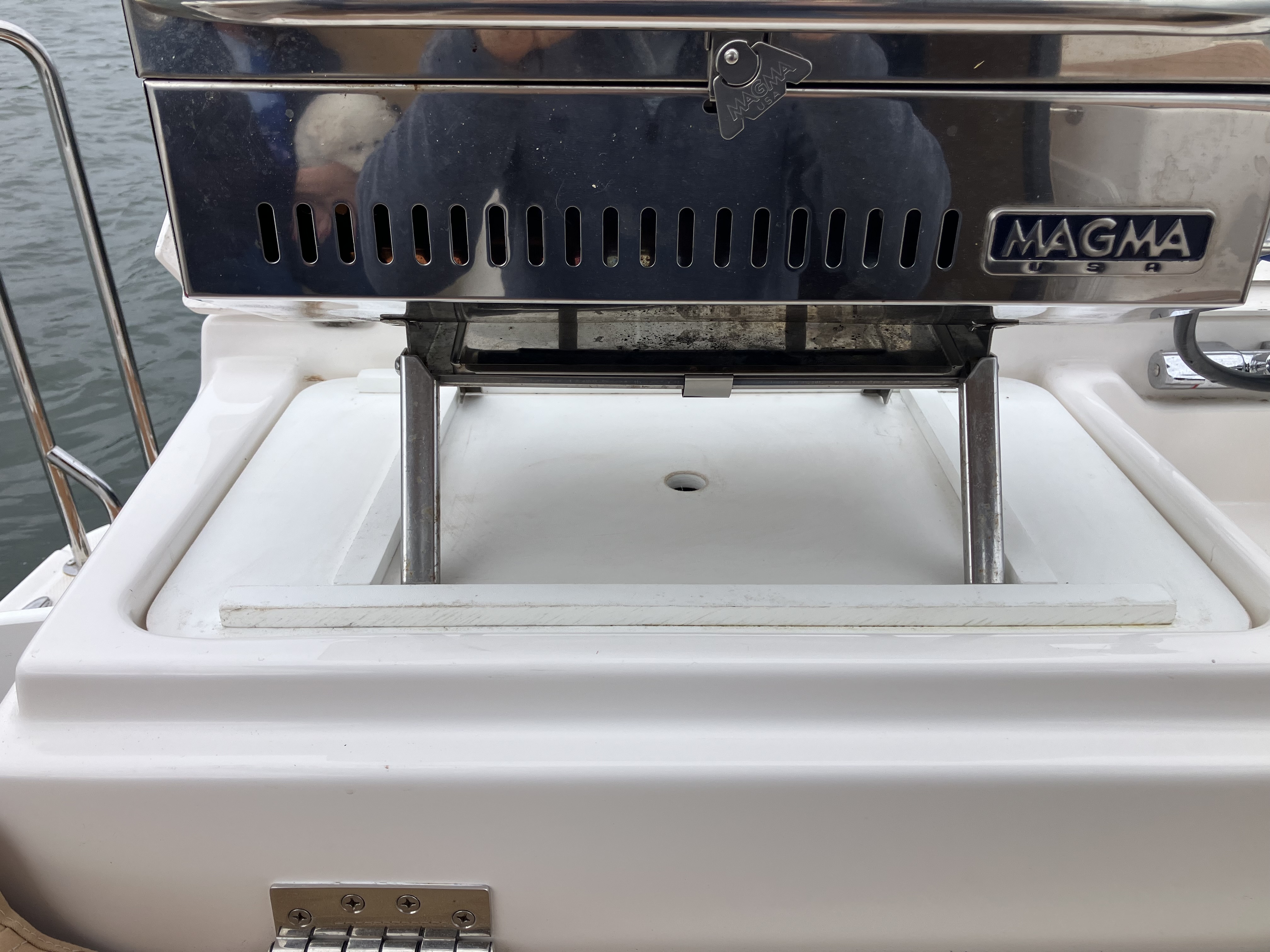 The baitwell is used as a trash lazerette. Both Kenyon and Magma grills are stored in the center cockpit locker. The spare tank goes in propane locker.