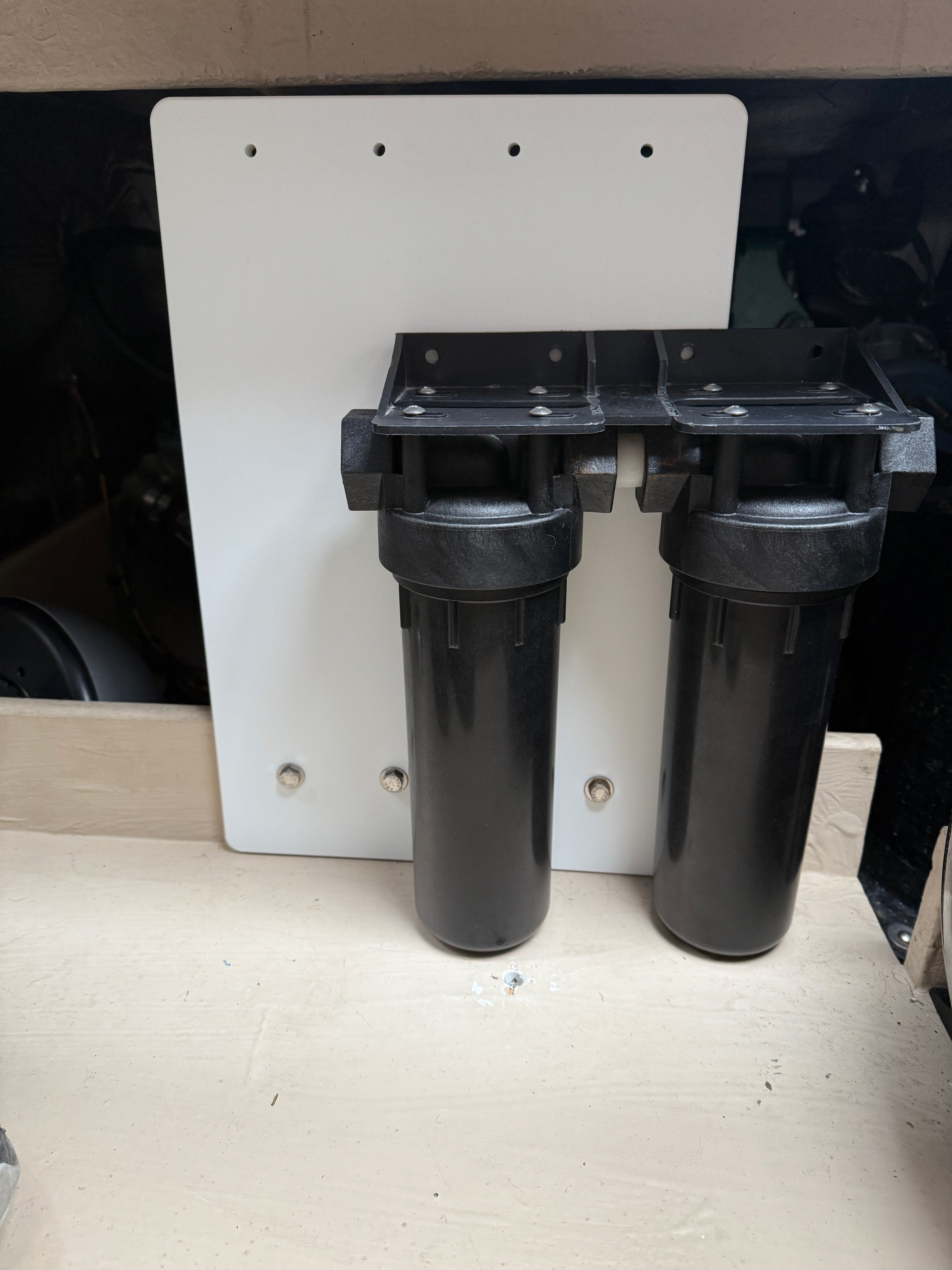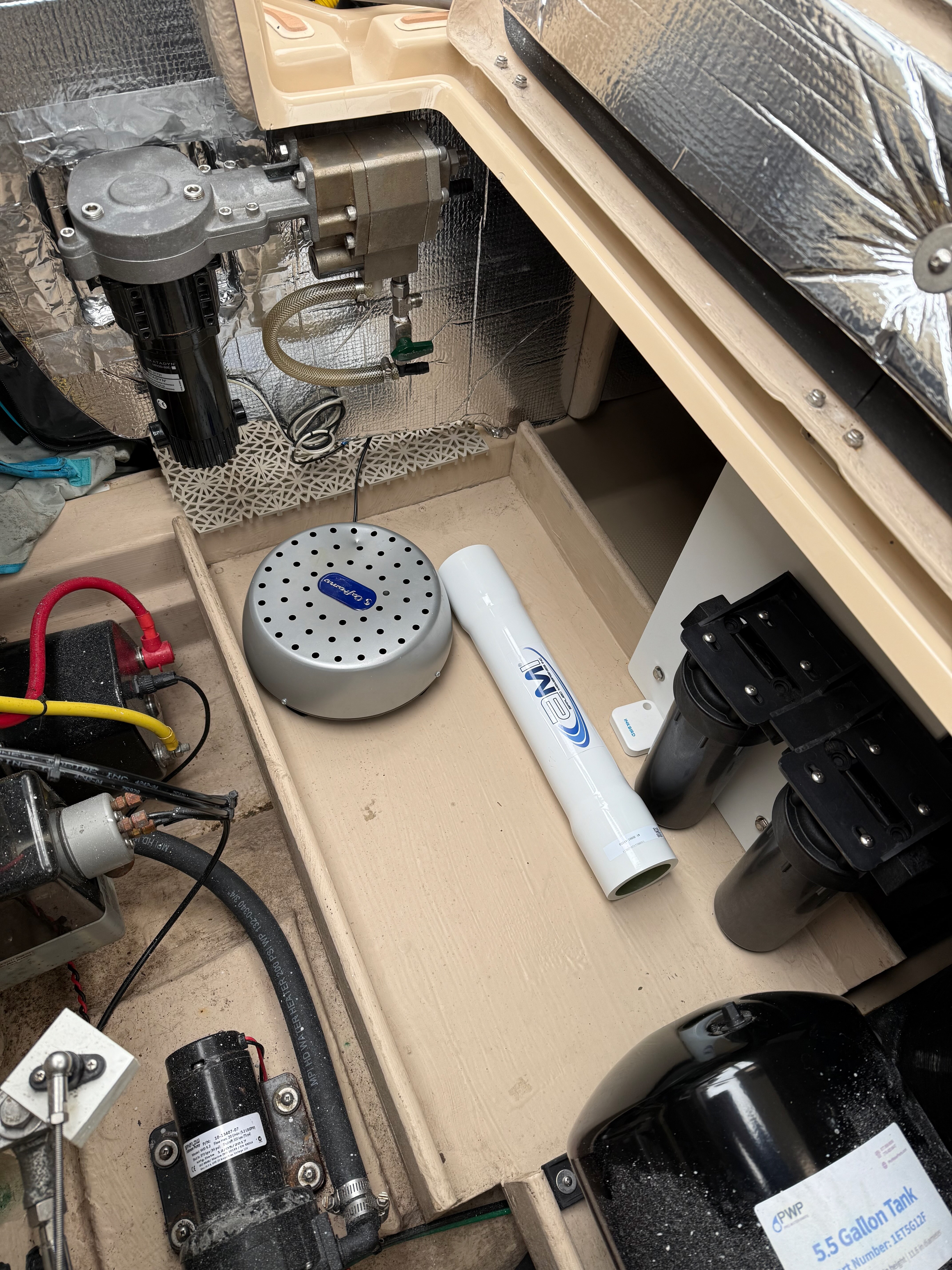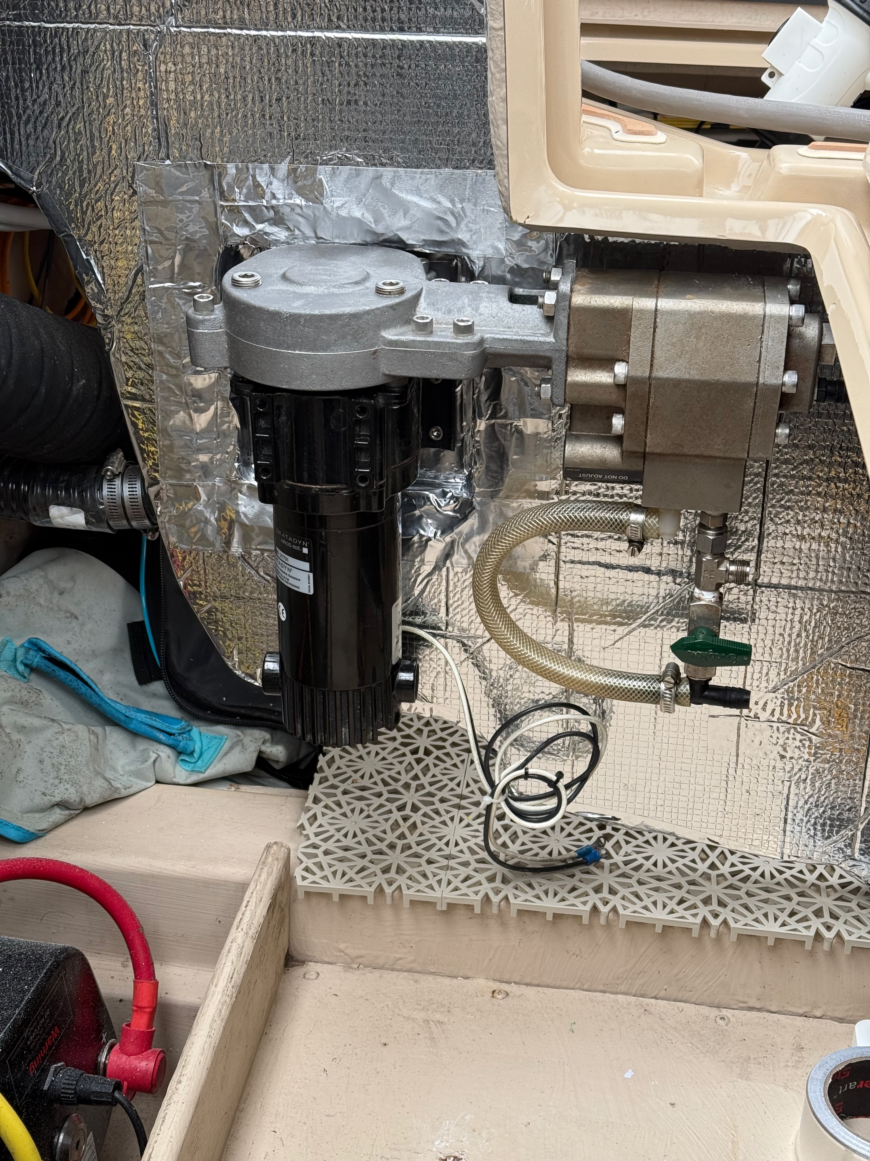 The work this weekend involved finalizing the layout of the system, and getting the main filter housing and pump installed. The location is under the cockpit seat where the generator would be installed on the luxury models.